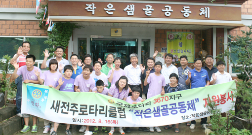 | ↑↑ 새전주로타리클럽 회원들이 작은샘골공동체에서 봉사활동을 펼친 뒤 원생들과 함께 기념촬영을 하고 있다. |