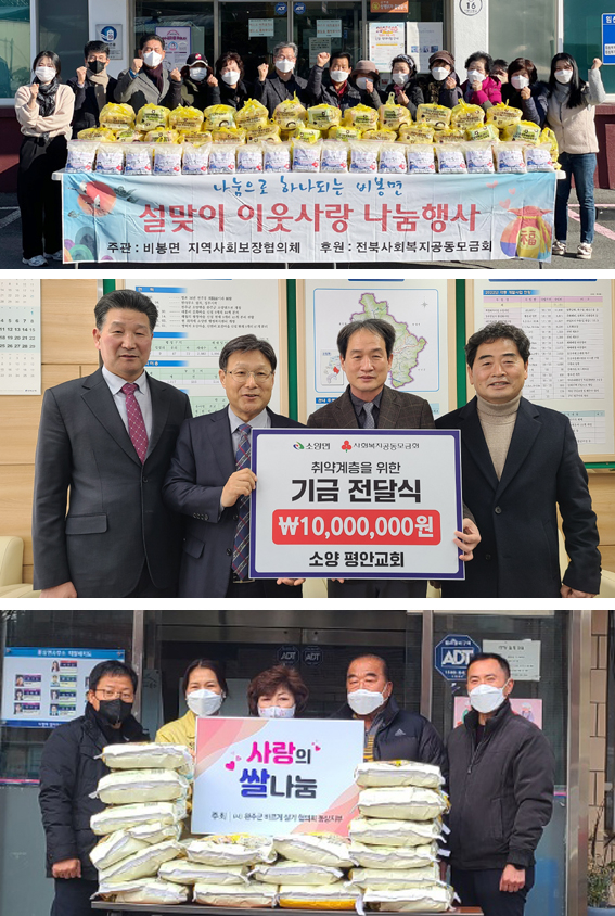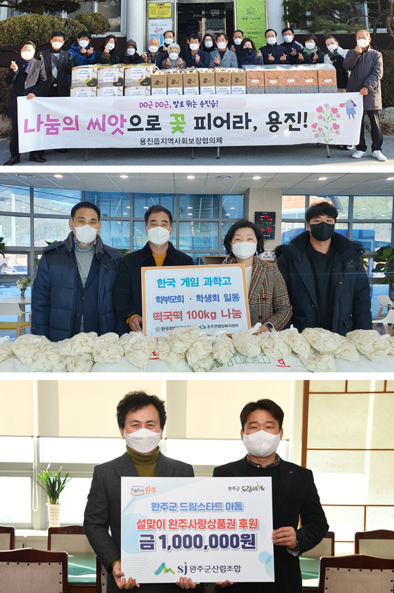 | ↑↑ (사진 위부터)용진읍 지사협, 한국게임과학고, 완주군산림조합의 사랑나눔 실천. |