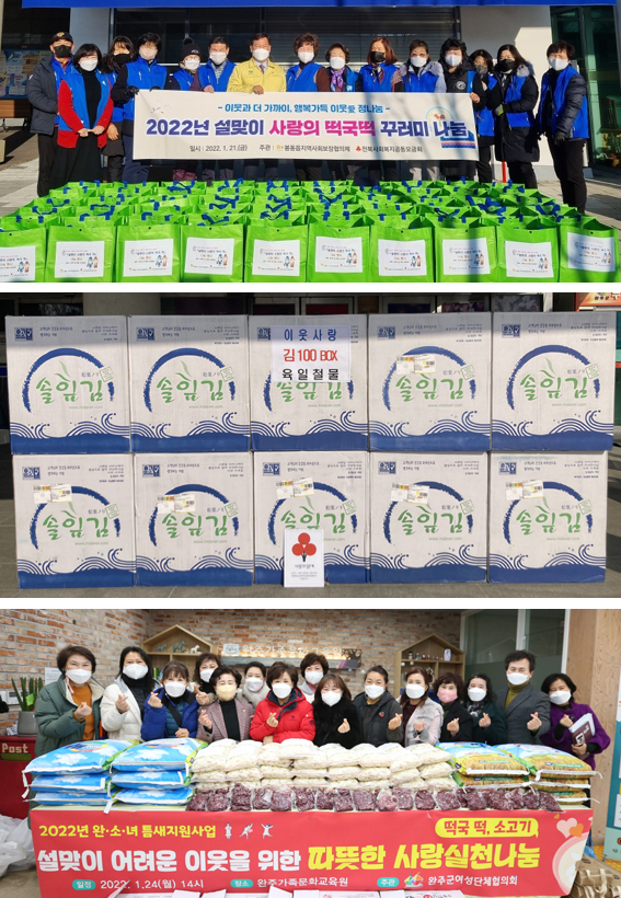 | ↑↑ (사진 위부터)봉동읍 지사협, 육일철물, 완주군여성단체협의회의 사랑나눔 실천. |
