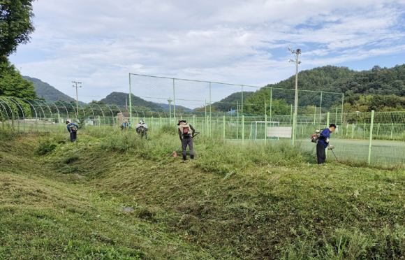 | ↑↑ 경천면 이장단을 비롯한 사회단체 회원들이 추석 명절을 앞두고 생활체육공원 일대 풀베기 등 환경정비에 나섰다. |