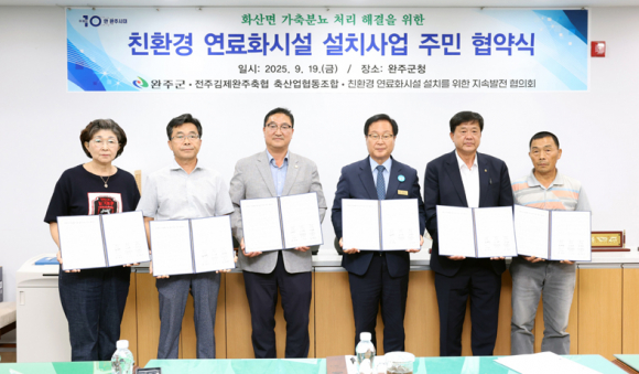 지난 19일 군은 전략회의실에서 화산면 운곡리 수실·돈의·부현마을 주민, 전주김제완주축협, 친환경 연료화시설 설치사업 지속발전협의회와 함께 ‘친환경 연료화시설 설치사업 주민 협약’을 체결했다.