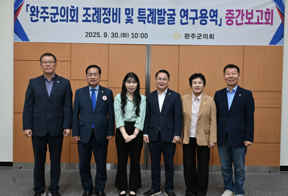 완주군의회 조례정비·특례 발굴 연구회(대표의원 성중기)는 지난 달 30일 의회 문화강좌실에서 「완주군 조례정비 및 특례발굴 연구용역」 중간보고회를 열고, 연구 진행 상황과 주요 성과를 점검했다.