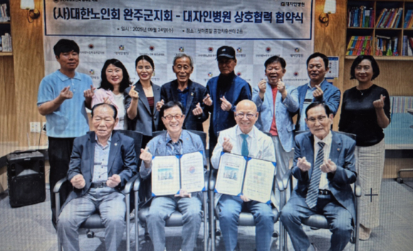 (사)대한노인회 완주군지회(회장 김영기. 이하 완주노인회)는 지난 달 24일 대자인병원(병원장 이병관)과 업무협약을 체결하고, 완주노인회원들의 건강과 복지증진을 위해 상호 협력키로 했다.