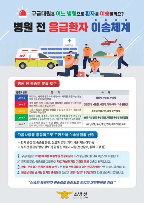 특히 최근 일부 현장에서 보호자나 환자 요구에 따라 특정 병원으로 이송을 요청하는 사례가 늘고 있으나, 환자의 생명과 예후에 직접 영향을 미치는 만큼 구급대원의 전문적 판단을 존중하는 문화 확산이 필요하다고 소방서는 강조했다.