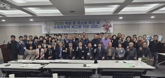 | ↑↑ (사)한국백합생산자중앙연합회가 백합 등 꽃 소비촉진 및 수출경쟁력 제고를 위한 세미나를 마친 뒤 기념촬영을 하고 있다. |