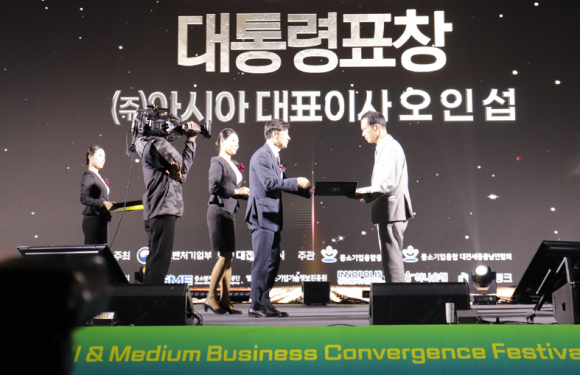| ↑↑ (주)아시아 오인섭 대표(사진 우측)가 2025 중소기업융합대전에서 개방형 혁신분야 대통령 표창장을 수상하고 있는 모습. |