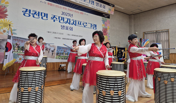 | ↑↑ 경천면 주민자치프로그램 발표회가 주민들과 함께하는 화합한마당으로 개최됐다. 사진은 난타 프로그램 발표회 모습. |