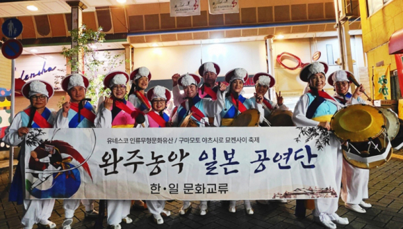 완주농악일본공연단(단장 이희수)은 지난 달 22일과 23일 양일간 일본 구마모토현 중남부 야츠시로 ‘묘켄사이(妙見祭)축제’에서, 완주 농악의 진수를 보여줬다.