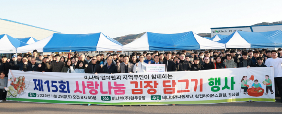 김장김치 10kg 200박스·백미 10kg 200포, 2천만 원 상당비나미래나눔재단이 비나텍(주) 완주공장 주차장에서 ‘제15회 사랑나눔 김장담그기’ 행사를 개최하고, 완주군에 총 2,000만 원 상당의 김장김치와 백미를 기탁했다.