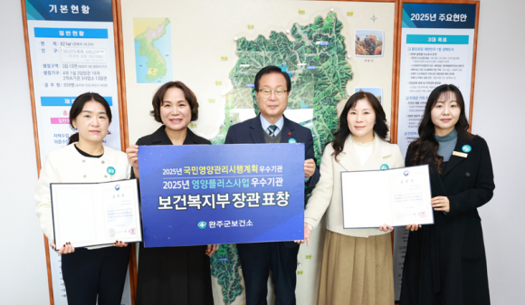 완주군이 보건복지부가 주관한 ‘2025년 지역사회 영양·신체활동·비만 예방 사업 성과대회’에서 국민영양관리시행계획과 영양플러스사업 등 2개 부문에서 ‘우수기관’으로 선정돼 2년 연속 보건복지부 장관 표창을 수상했다.