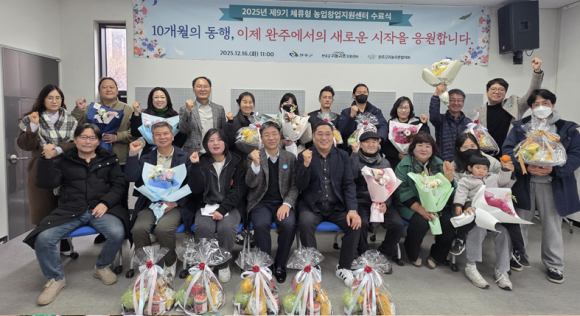 완주군이 제9기 체류형 농업창업지원센터 수료생 전원(100%)의 지역 정착이라는 성과를 거뒀다. 지난 16일 군은 귀농귀촌 게스트하우스 공감마당에서 ‘제9기 체류형 농업창업지원센터 입교생 수료식’을 열었다.