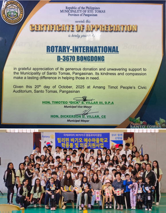 | ↑↑ 봉동로타리클럽과 (주)성실기업이 지원한 학용품을 받아든 필리핀 바기오 예수마을학교 학생들과 교직원들이 기념촬영을 하고 있는 모습(사진 아래)과 필리핀 산토토마스 시당국이 봉동로타리클럽에 수여한 감사패(사진 위) 모습. |