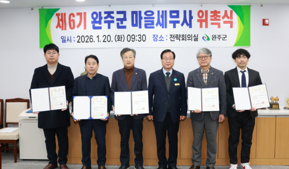 완주군은 지난 20일 ‘제6기 마을세무사’ 위촉식을 가졌다. 마을세무사는 김재곤, 김건영, 김현승, 소창섭, 유희춘, 정원서 등 6명으로, 임기는 오는 2027년 12월 31일까지 2년이다.