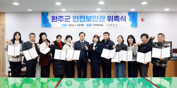 완주군이 최근 ‘2026년 완주군 안전보안관 위촉식’을 열고 신규 안전보안관 12명에게 위촉장을 수여했다.