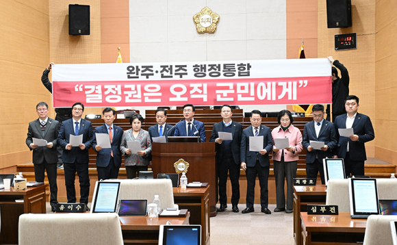 완주군의회(의장 유의식)는 지난 11일, 제298회 임시회 제2차 본회의를 마친 뒤 본회의장에서 완주·전주 행정통합에 대한 공식 입장문을 발표했다.