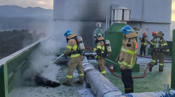 반대편에서 연기를 발견한 관리사무소 직원은 즉시 옥상으로 올라가 소화기 2대를 이용해 화재를 자체 진화했다.