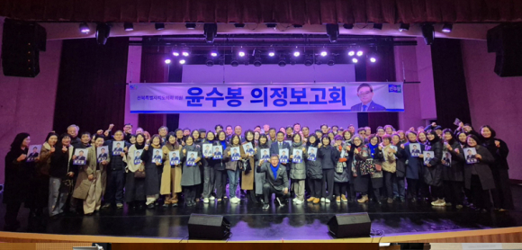 | ↑↑ 윤수봉 도의원이 의정보고회를 열고 의정 성과와 활동을 공유하는 시간을 가졌다. 사진은 의정보고회 기념촬영 모습. |