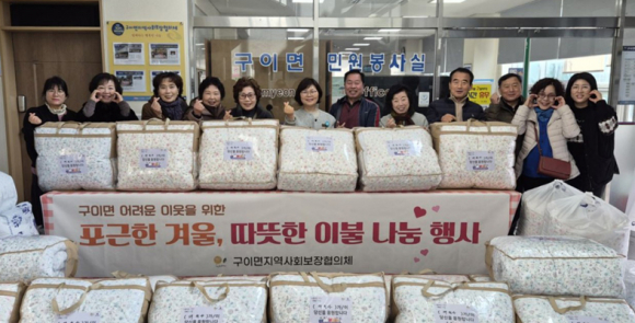 20가구에 나눔… 안부 챙기고 겨울 안전수칙도 안내구이면 지역사회보장협의체(공동위원장 최은아·전호순)가 지난 3일, 관내 취약계층 홀몸노인 20가구를 대상으로 ‘포근한 겨울나기 이불 나눔사업’을 펼쳤다.