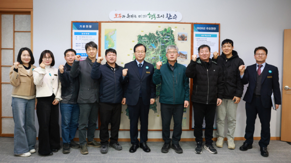 | ↑↑ 유희태 군수가 완주조경수협동조합과 간담회를 갖고 조경수 산업의 경쟁력 강화를 위한 정책방향을 모색했다. 간담회 후 기념촬영. |