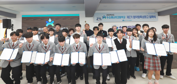 | ↑↑ 수소에너지고등학교가 2026학년도 신입생 전원에게 장학금을 지급했다. 사진은 입학식 및 장학금 전달식 기념촬영 모습. |