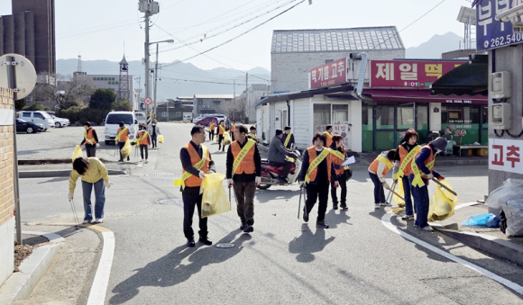 | ↑↑ 고산면이 새봄을 맞아 쾌적한 생활환경 조성을 위해 읍내 소재지권 대청소를 전개했다. 사진은 도로변 환경정화활동 모습. |