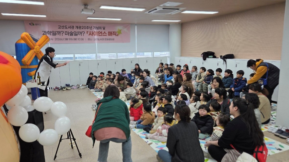 | ↑↑ 고산도서관이 개관 20주년 맞이 독서·문화 프로그램을 마무리했다. 사진은 어린이 과학 마술 ‘사이언스 매직’ 공연 모습. |