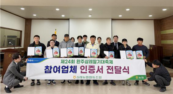 삼례농협(조합장 강신학)이 지난 달 8일 막을 내린 ‘제24회 삼례딸기대축제’에 참여한 업체에게 인증서를 전달했다.
