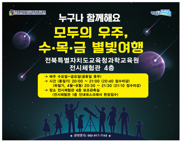 전북특별자치도교육청과학교육원(원장 강진순, 이하 과학교육원)은 4월 과학의 달과 봄을 맞아 도민들에게 밤하늘의 신비로움을 선사하고자 ‘봄철 별자리와 함께하는 수·목·금 별빛여행’을 운영한다.