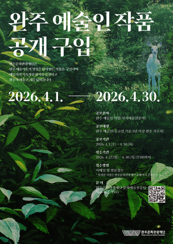 (재)완주문화관광재단이 지역 미술 시장 활성화와 예술인의 안정적인 창작 환경 조성을 위해 ‘2026 완주 예술인 작품 공개 구입’사업을 실시한다.